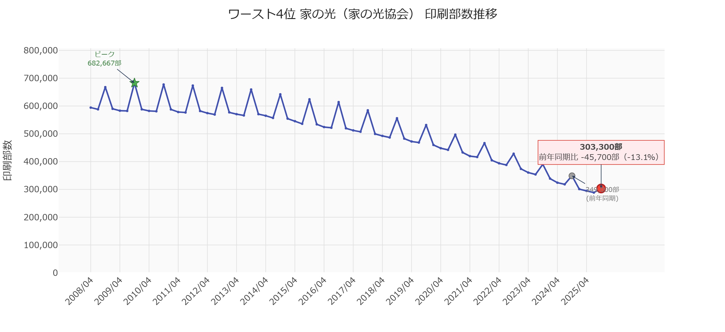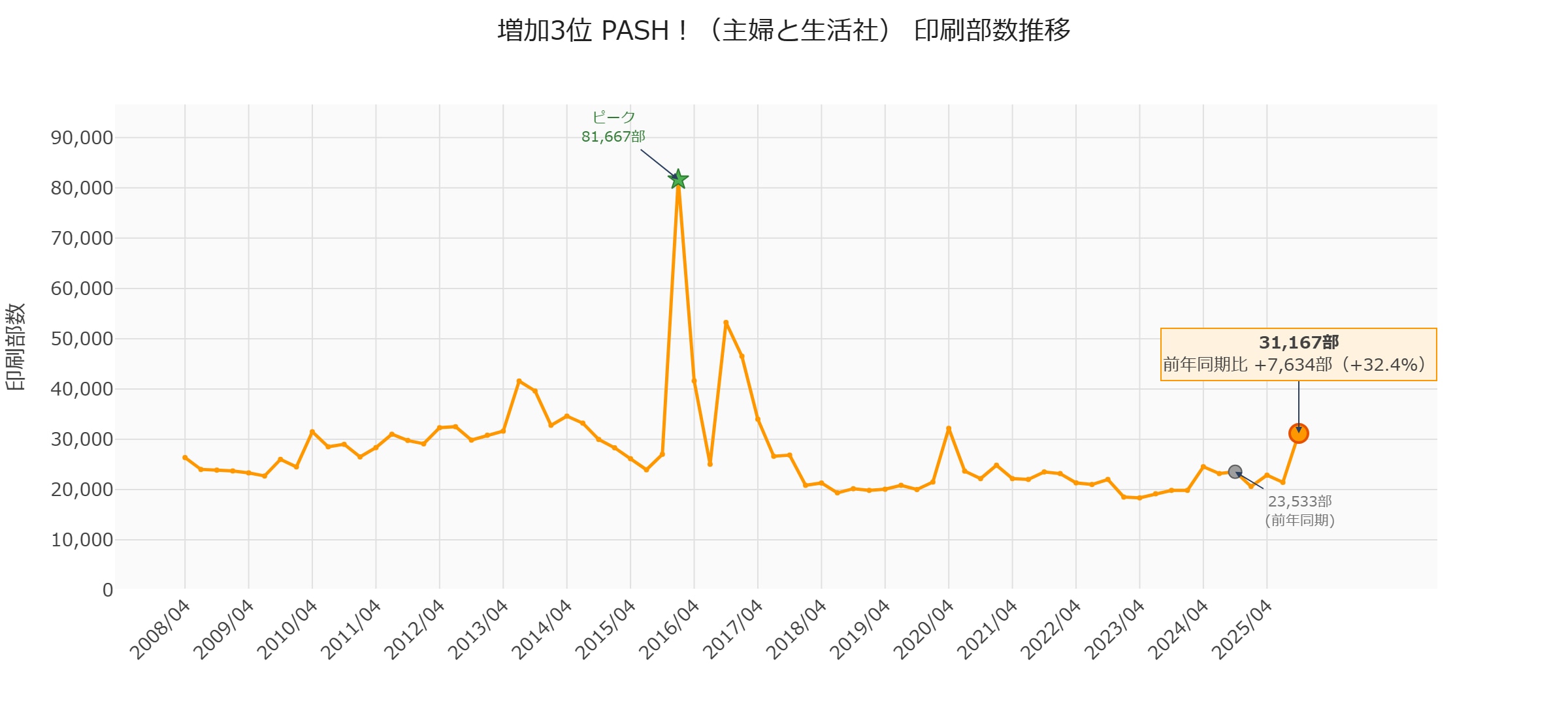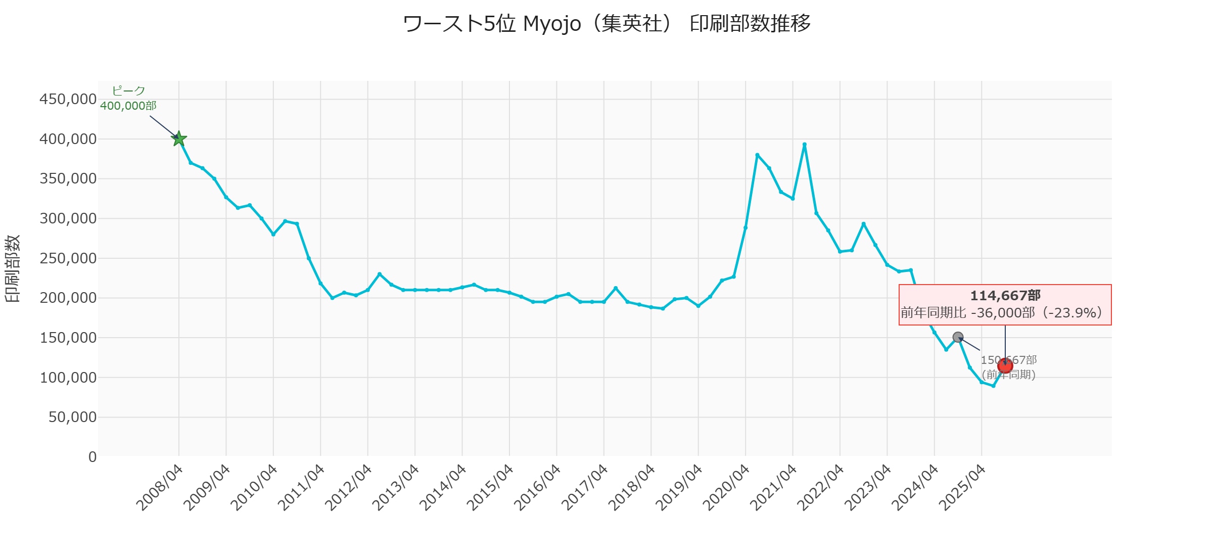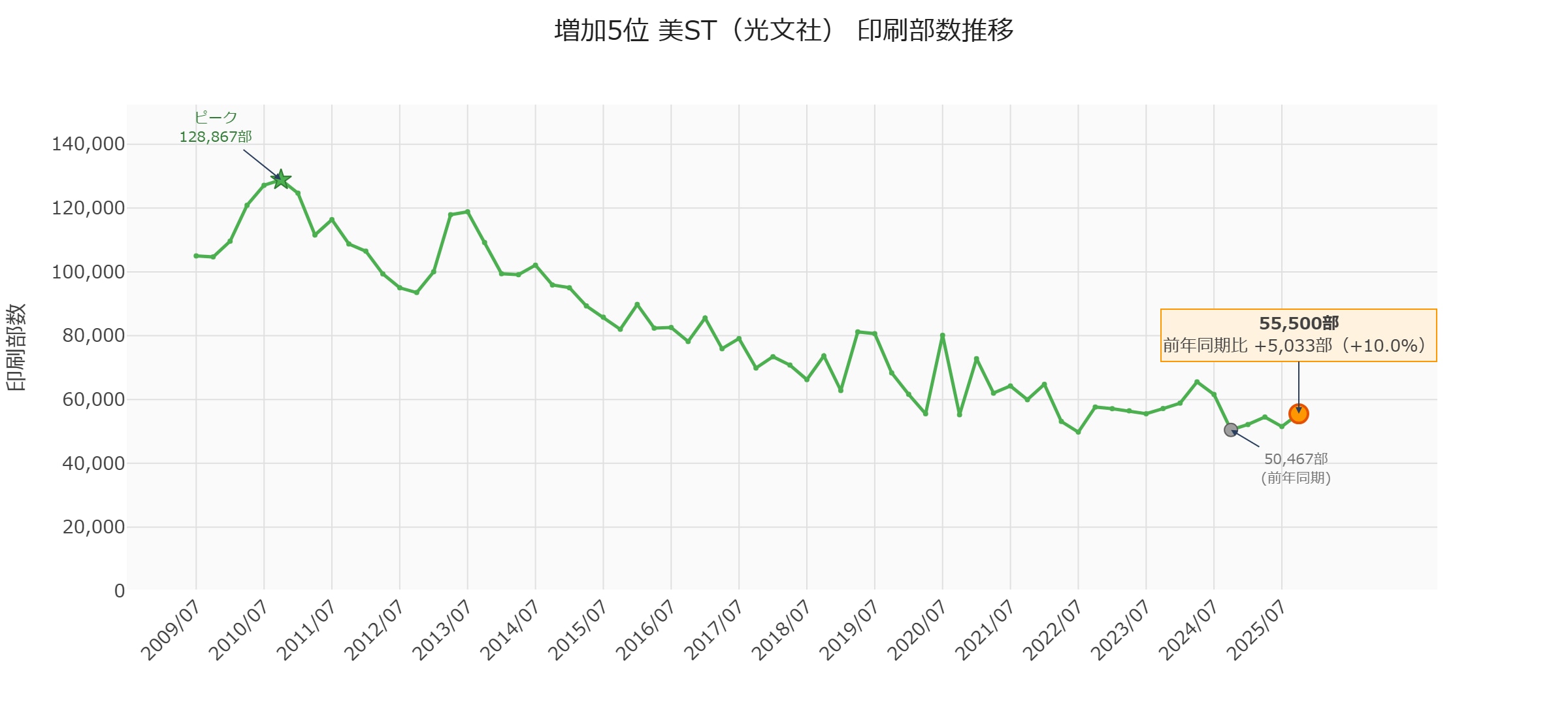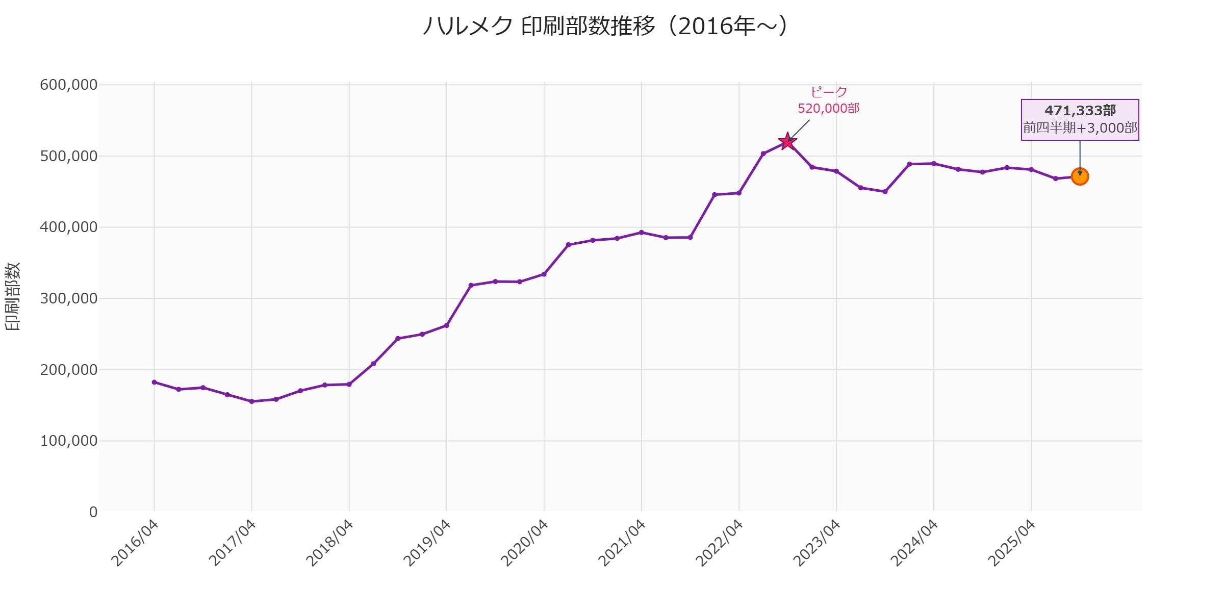 前年同期比ではマイナスですが、前四半期(468,333部)からは**+3,000部の微増**に転じています。2025年7月を底に下げ止まりの兆しが見えます。