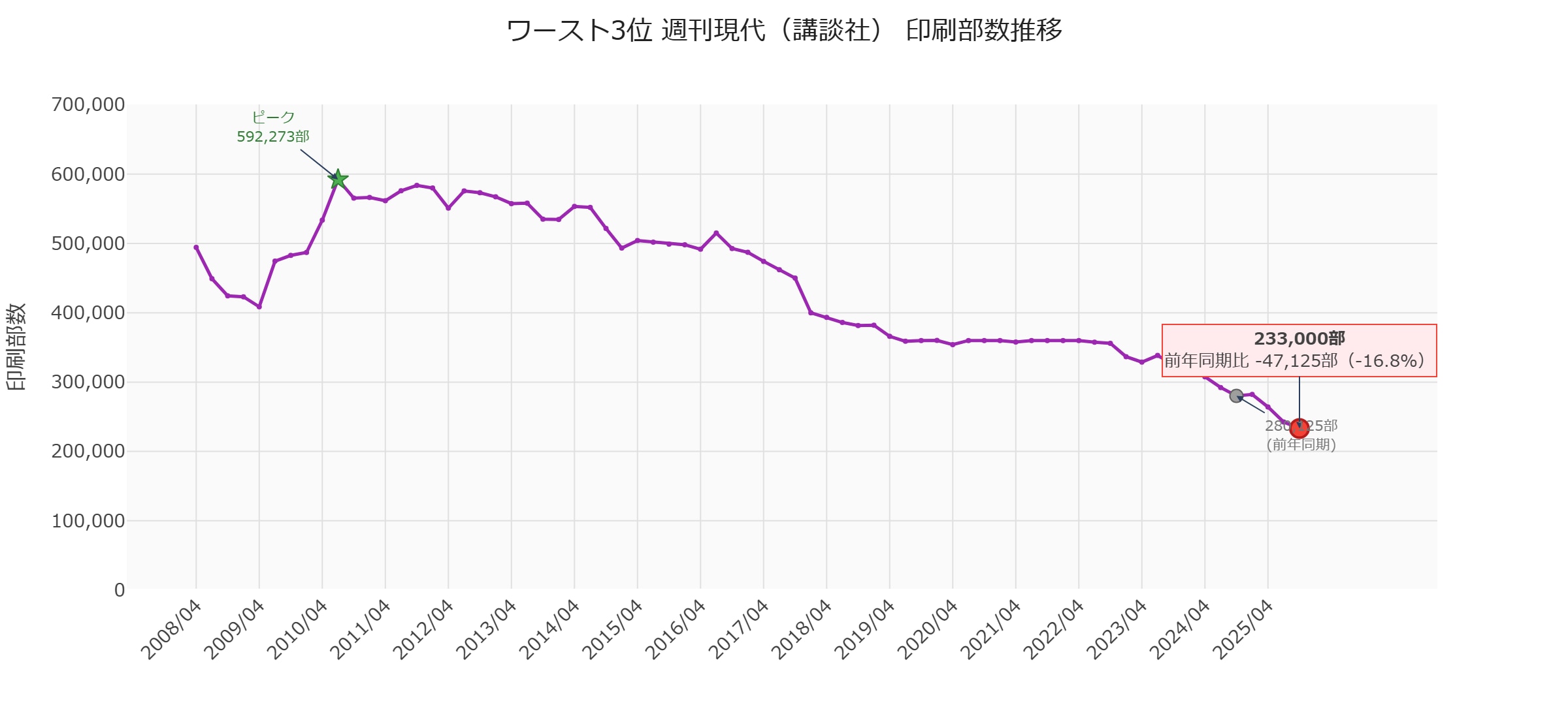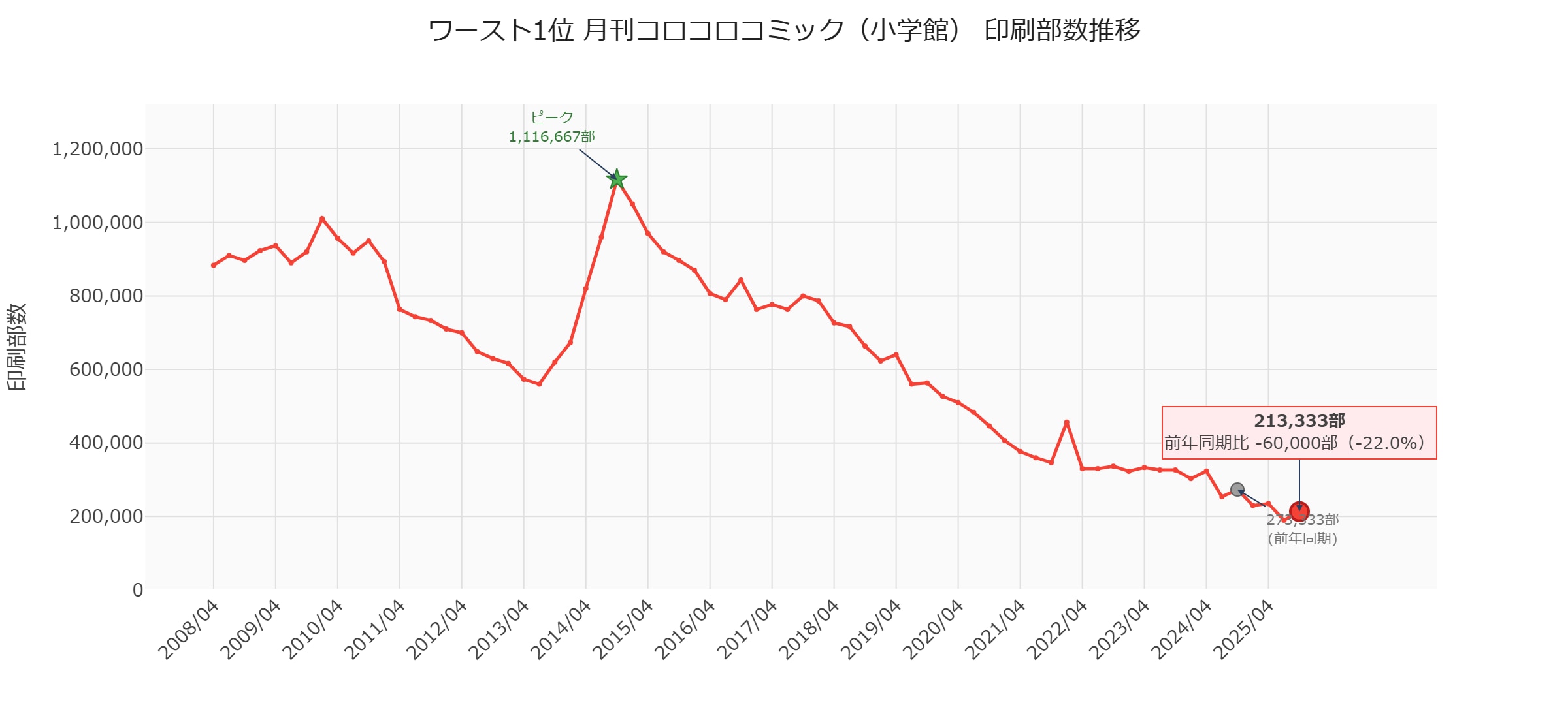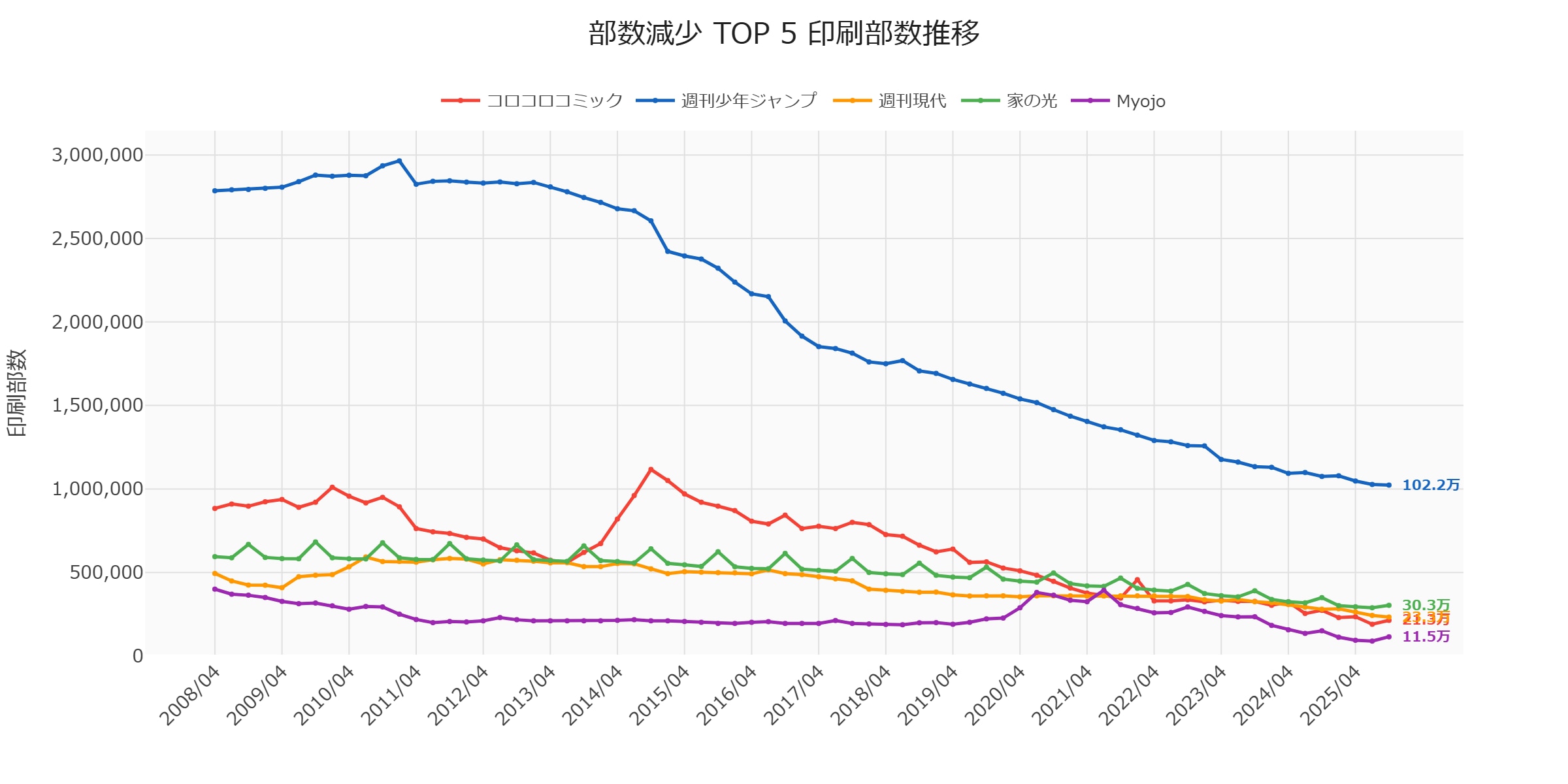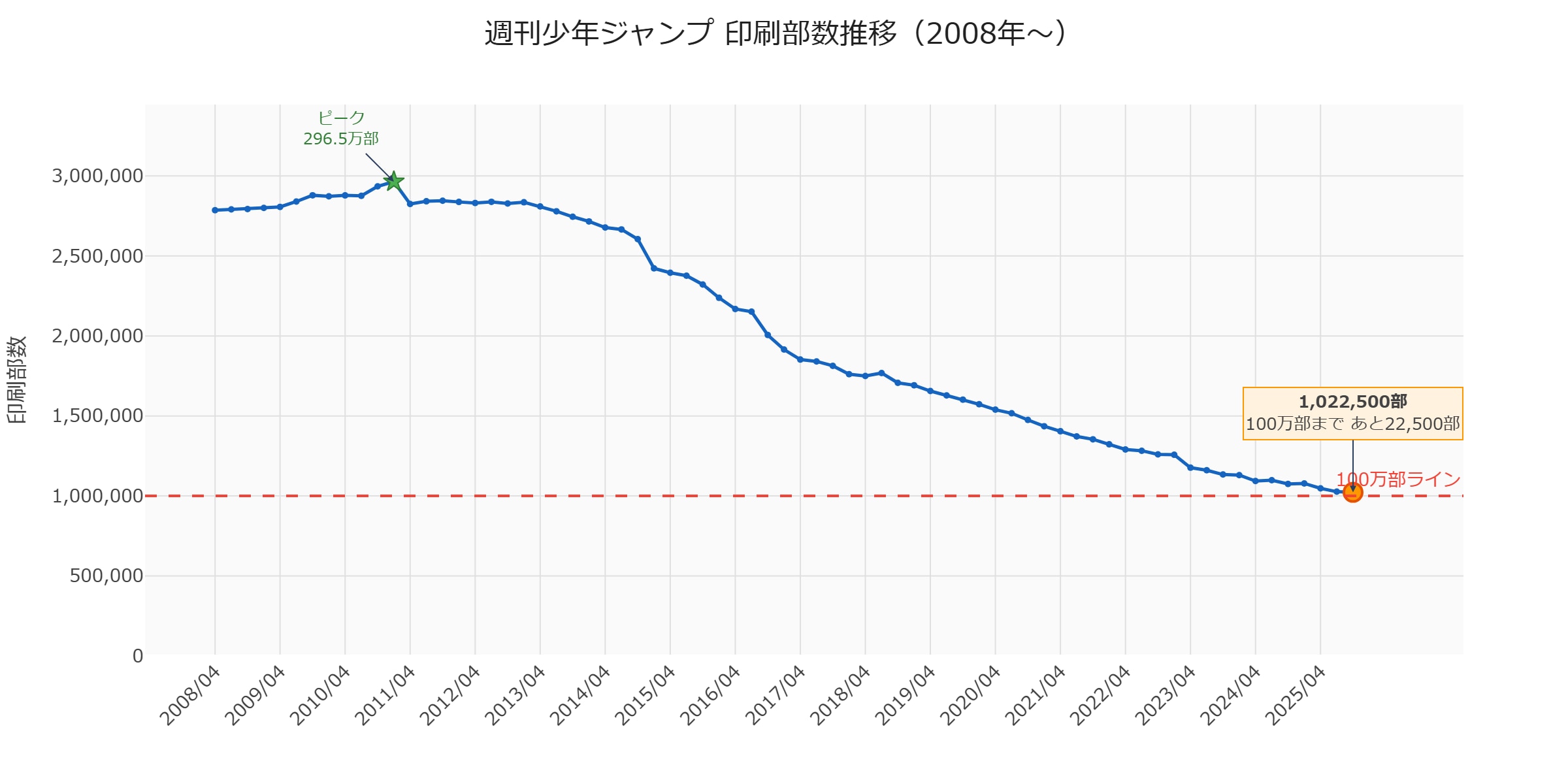 100万部ラインの維持は四半期ごとに厳しさを増しています。次期(2026年1-3月期)のデータ公開時には、いよいよ100万部割れとなる可能性が高い状況です。