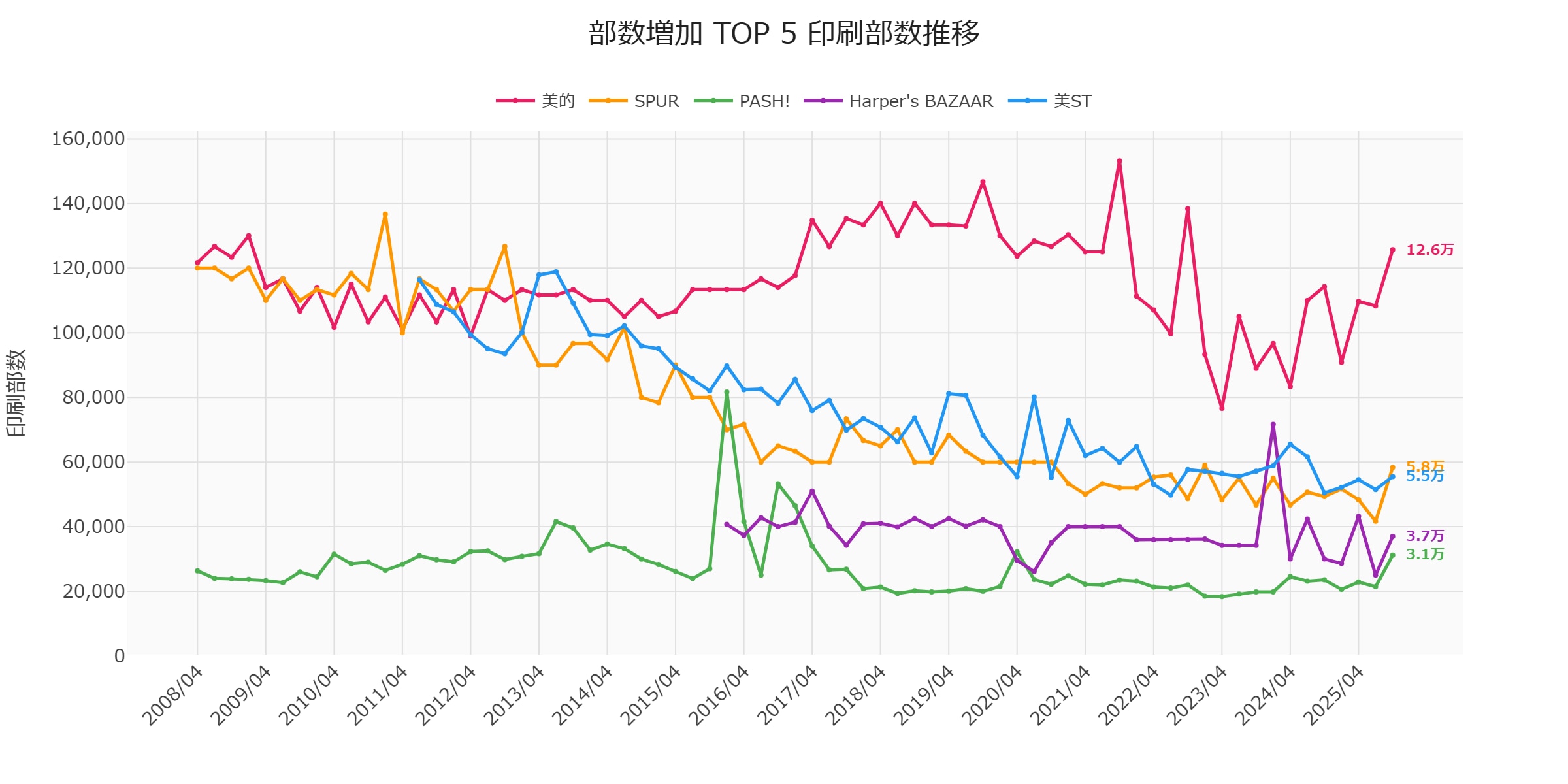 K-POP(SPUR、Harper's BAZAAR)、中国ゲーム(PASH!)、韓国コスメ(美的)と、 海外発のIPを活用した雑誌が軒並み成長 しています。国内コンテンツだけでは部数維持が困難な時代に、海外IPの取り込みが生き残りの鍵となりつつあります。