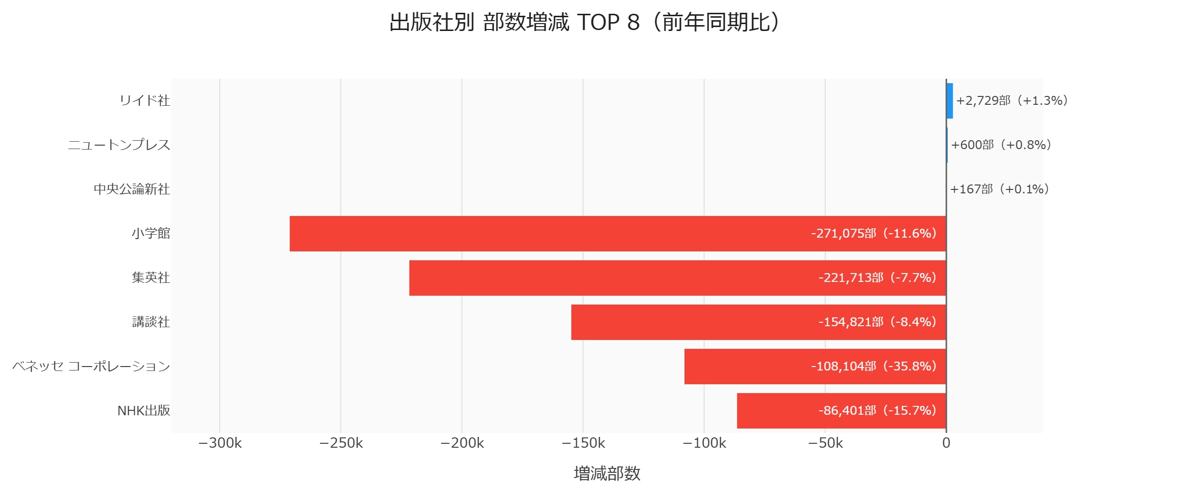 全出版社のうち、部数が増加したのは わずか3社のみ です。前期の2社よりは改善していますが、依然として極めて厳しい状況です。