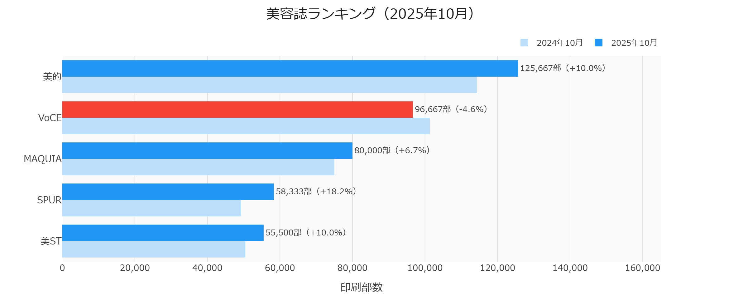 前期記事で「VoCE首位返り咲き」と報じましたが、わずか1四半期で美的が再逆転しました。美的は125,667部に対しVoCEは96,667部と、その差は 約29,000部 にまで広がっています。