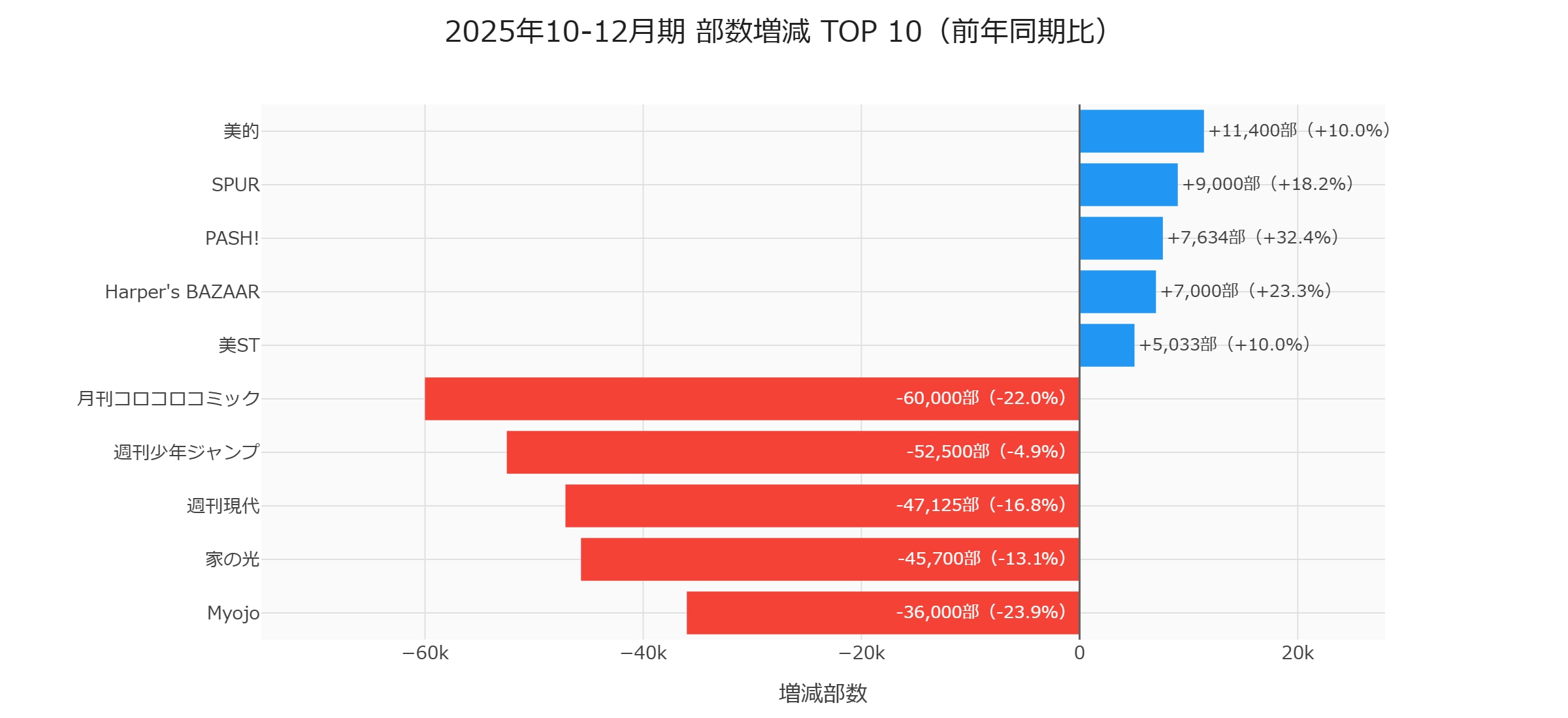 コロコロコミック(-60,000部)、女性セブン(-27,500部)など幅広い媒体で減少