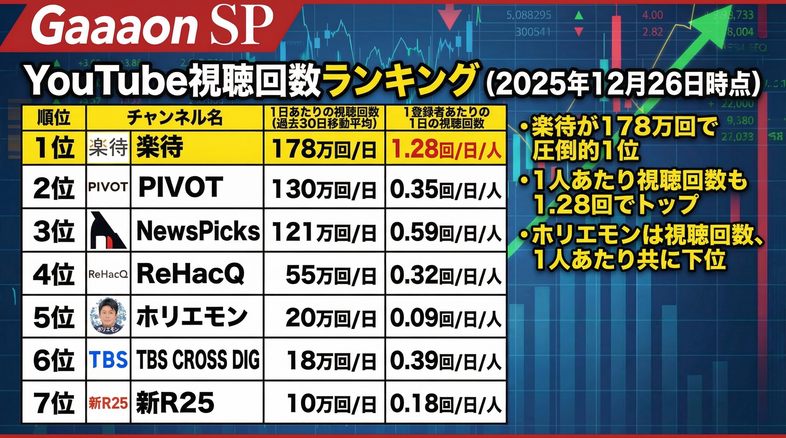 登録者数では5位だった楽待が、1日の視聴回数では 1位 に躍り出ます。