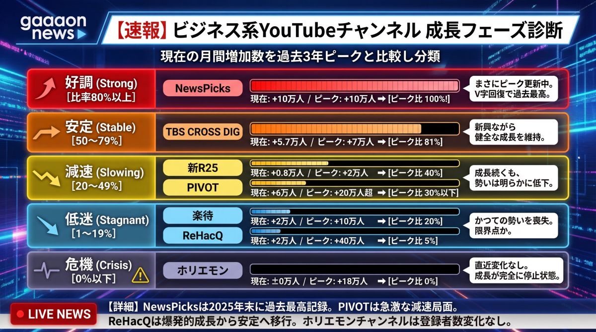 本記事では、約3年間(2022年12月〜2025年12月)の時系列データを分析し、「登録者数」だけでは見えない経済YouTubeの勢力図の変化を明らかにします。