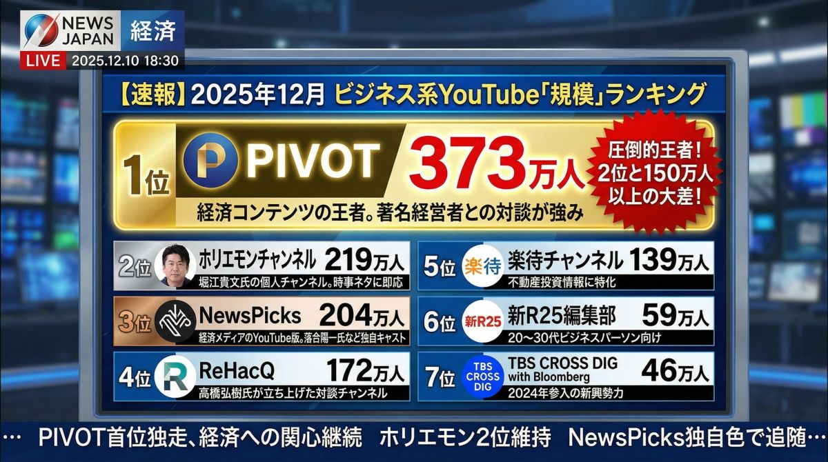 | 1位 | PIVOT | 373万人 | 経済コンテンツの王者。著名経営者との対談が強み |
