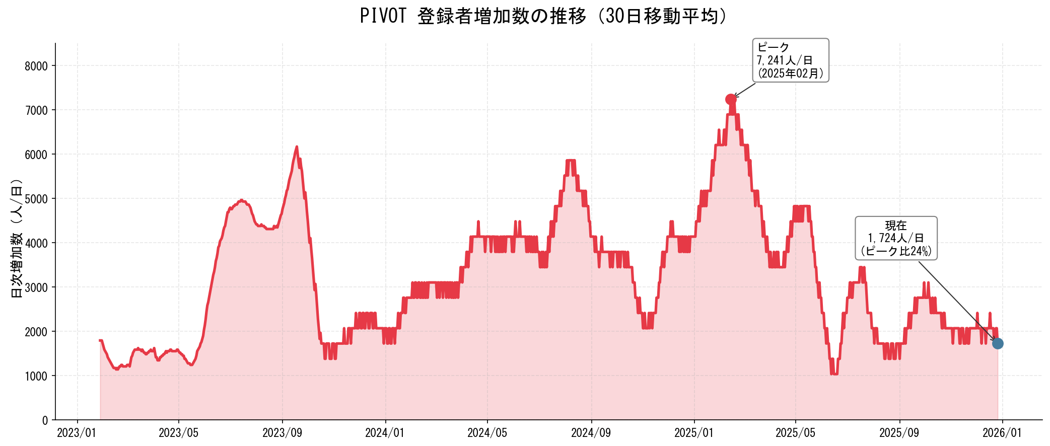 2025年2月、PIVOTは月間で 約20万人以上 を獲得するペースで成長していました。しかし、そこから10ヶ月で 月間+6万人 まで減速。かつての勢いの3分の1以下です。