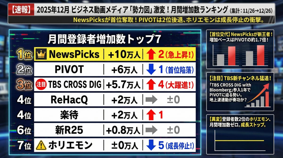 2025年の経済YouTubeチャンネルを総括します。PIVOT減速、NewsPicks逆転、TBS急成長。そして隠れた王者楽待を深堀り。