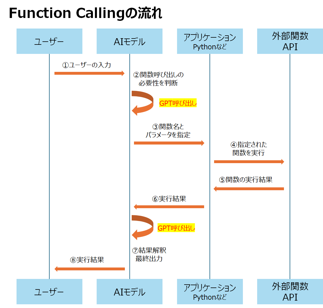 流れは図で確認すると分かりやすいかと思います。以下はGPTでFunction Callingを行った場合の挙動プロセスです。