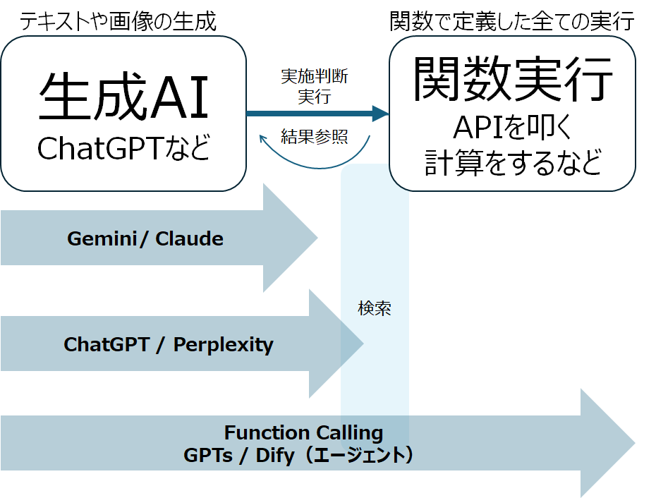 といった複雑な操作も可能となります。Function Callingは 簡単に言えば、 外部ツール(いわゆるAPIや設定した関数)を生成AIに操作させる機能、ということです。