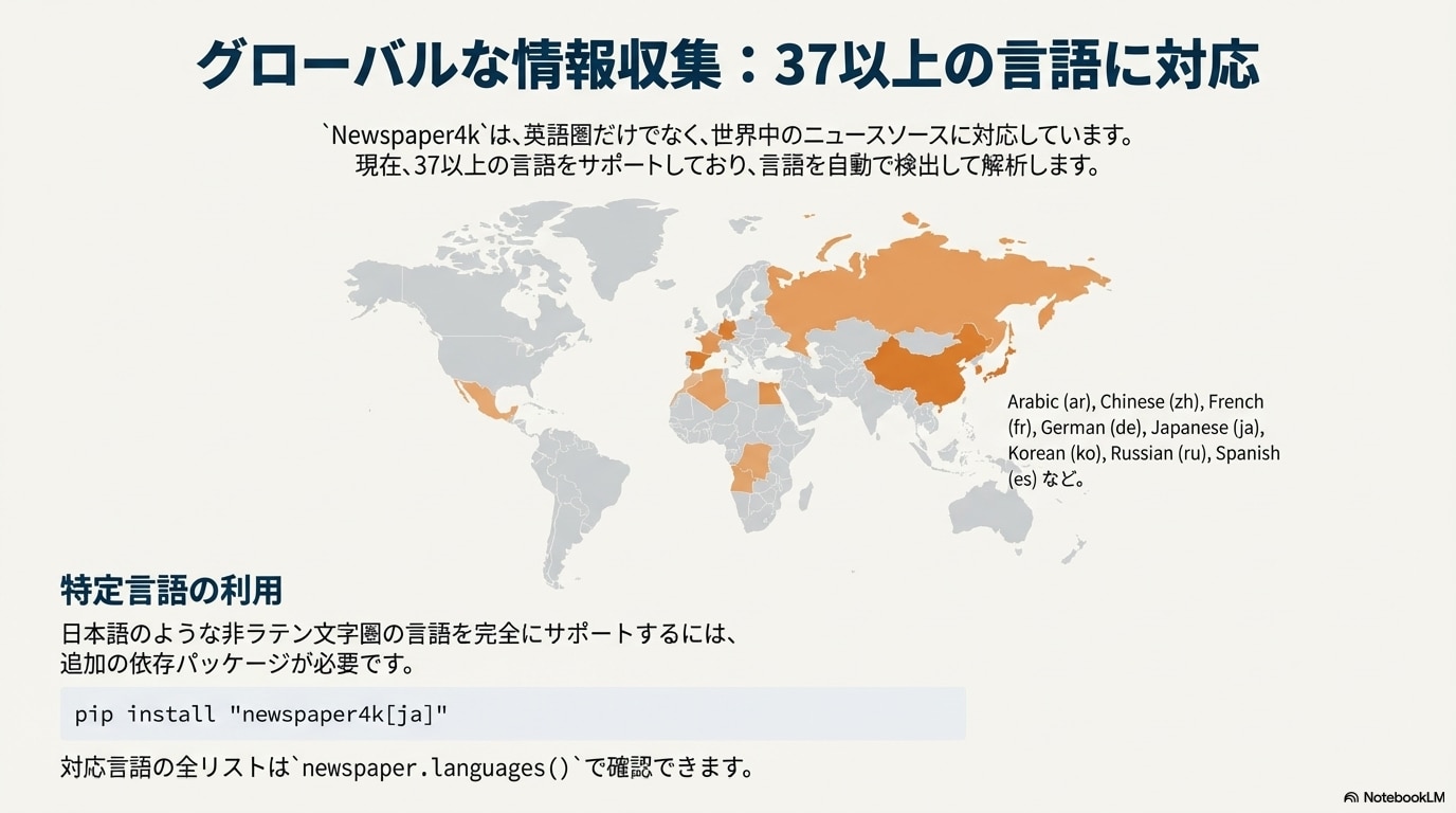 80以上の言語に対応しており、日本語、英語、中国語、スペイン語など、多言語のニュースサイトから情報を抽出できます。言語は自動検出されるため、特別な設定は不要です。