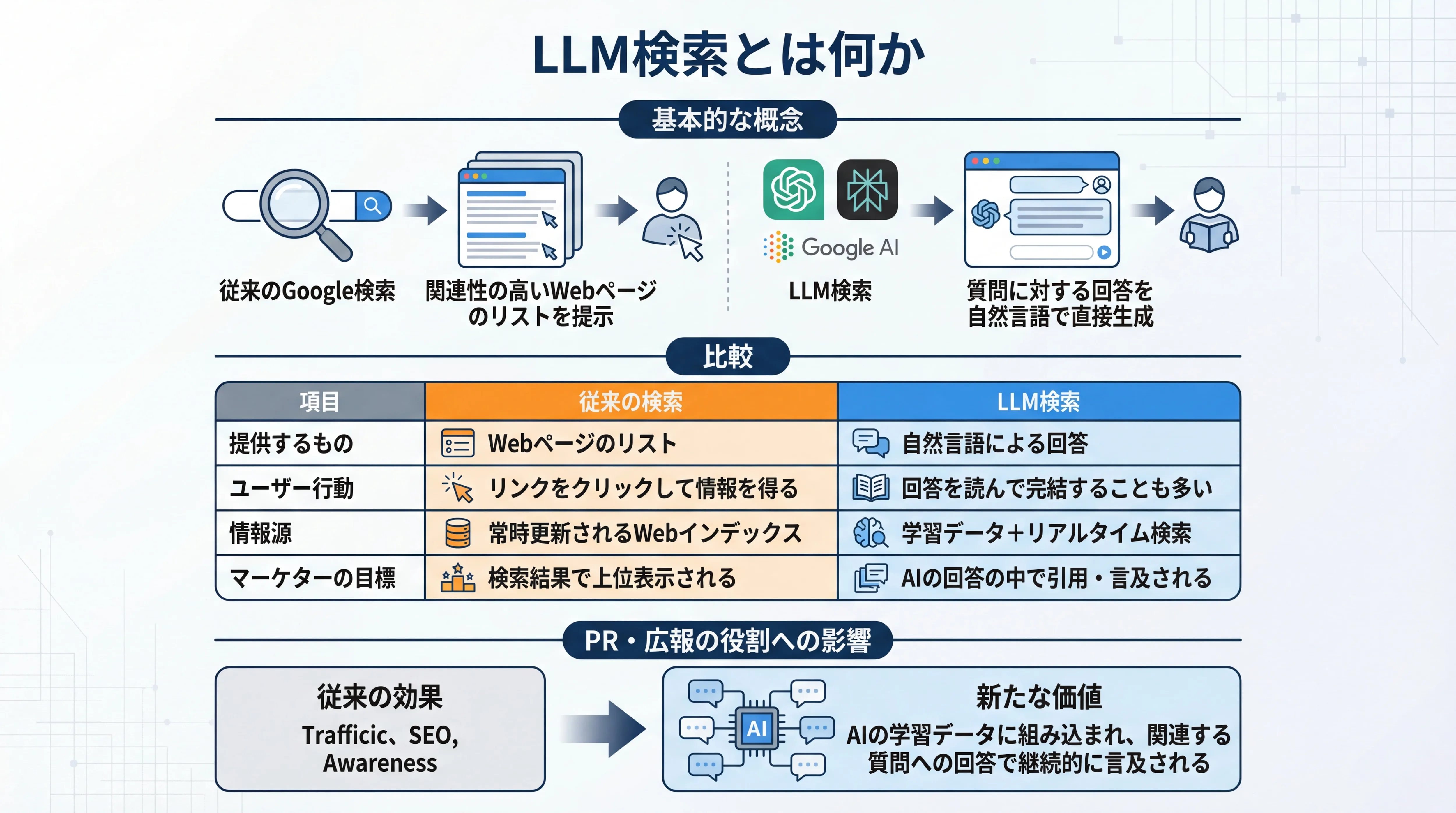 従来のGoogle検索が「関連性の高いWebページのリストを提示する」のに対し、LLM検索は「質問に対する回答を自然言語で直接生成する」という点で根本的に異なります。