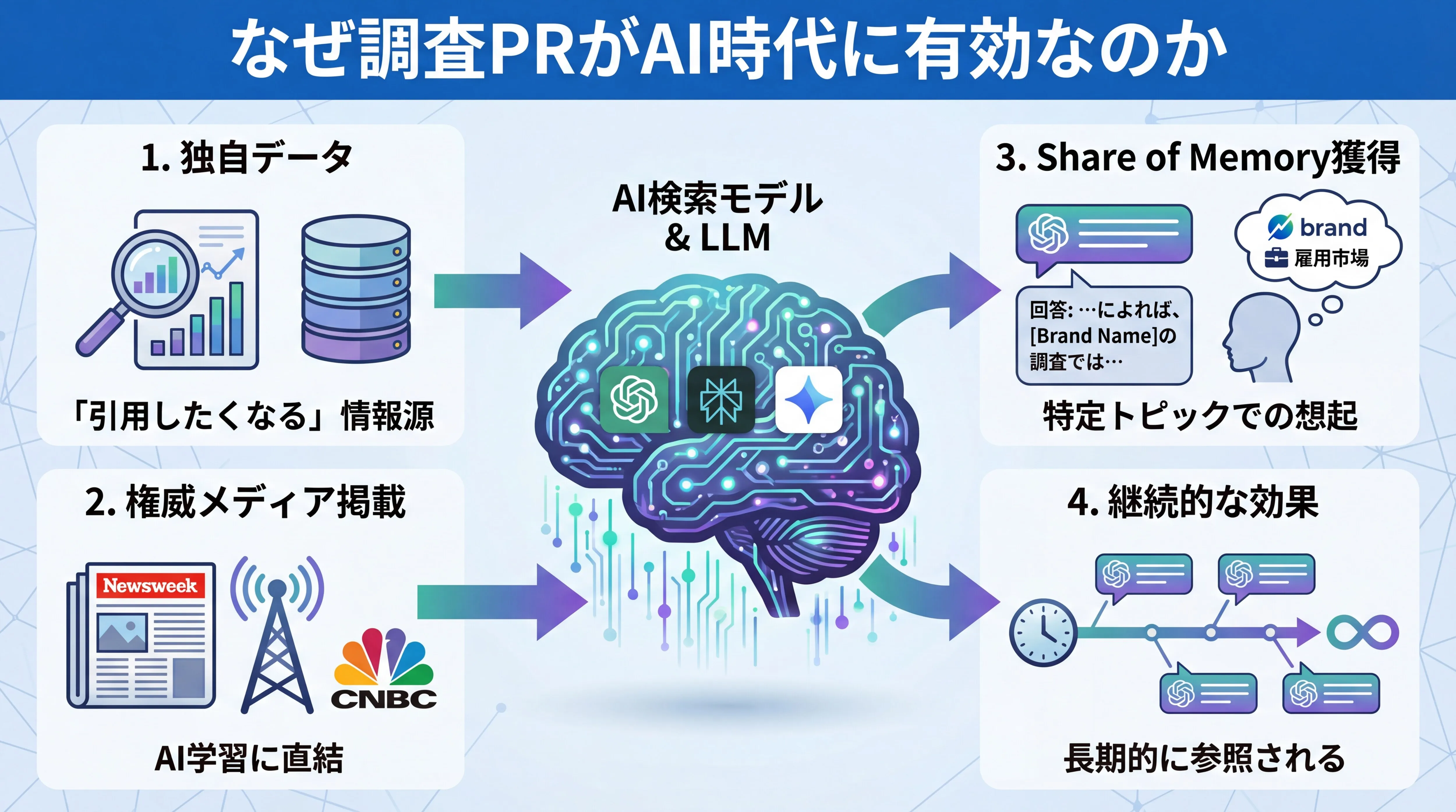 単発の調査で終わらせず、特定のトピックについて継続的にデータを出し続けることで、AIに対して 「このトピックといえば、この会社」 という関連付け(アソシエーション)を学習させる必要があります。